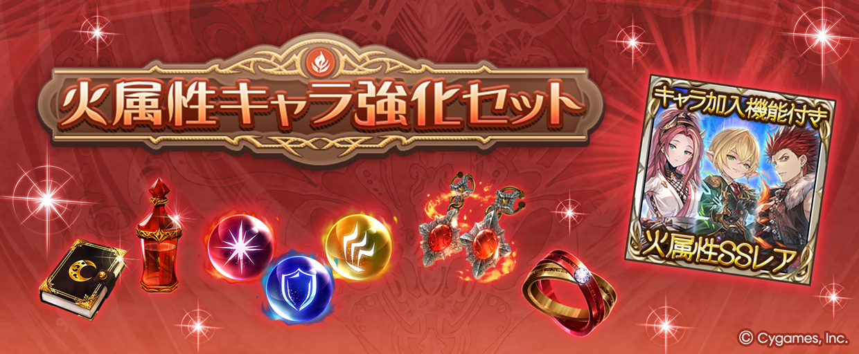 ● 「火属性キャラ強化セット」とは新たな団員を必ず仲間にすることができる「キャラ加入機能」がついた「新団員募集ガチャチケット」と、「殊越の指輪」や「焦熱の耳飾り」などキャラクターの育成アイテムがセットで登場!