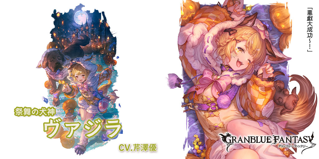 十二神将より犬神の「ヴァジラ」が、ハロウィンのお祭りのために仕立てられた可愛らしい衣装を身にまとい、光属性のSSレアキャラクターとして登場します!
