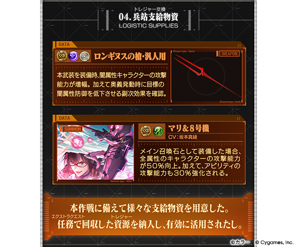 エクストラクエストで獲得したトレジャーで、イベント限定召喚石「マリ&8号機」やイベント限定武器「ロンギヌスの槍・汎人用」を獲得しよう!