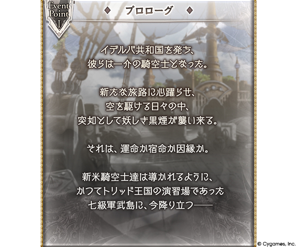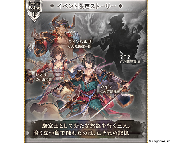 カイン、ラインハルザ、レオナの3人は、イデルバ共和国が復興に向かって歩み始めたのを見届けると、念願だった旅へと発った。新米騎空士として心躍る日々を送っていたところ、突如として妖しき黒煙が騎空艇を襲う。こうしてカイン達は、かつてトリッド王国の演習場として使われていた「七級軍武島」に急遽降り立つことに。そこで彼らは異様な少年と邂逅する。それは、運命か宿命か因縁か──