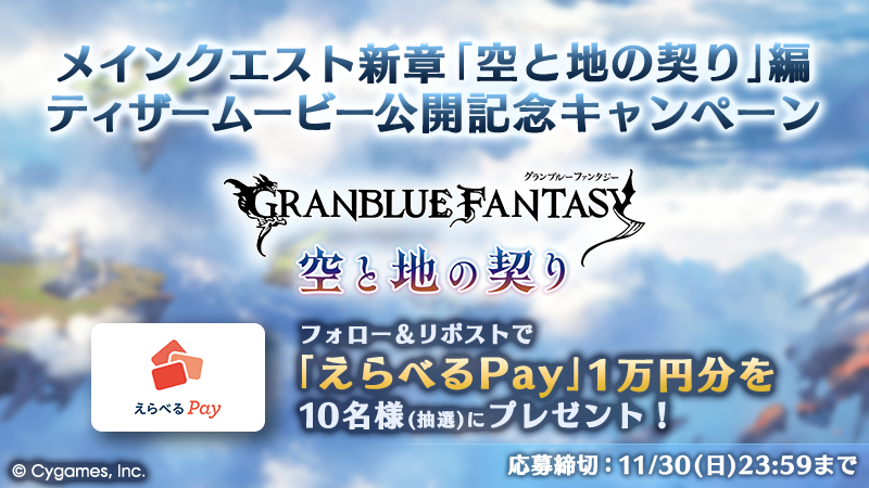 ● 概要応募期間中に「グランブルーファンタジー」公式Xアカウントから投稿された対象ポストを、リポスト(RP)いただいた方の中から抽選で「えらべるPay」1万円分が当たるキャンペーンです。