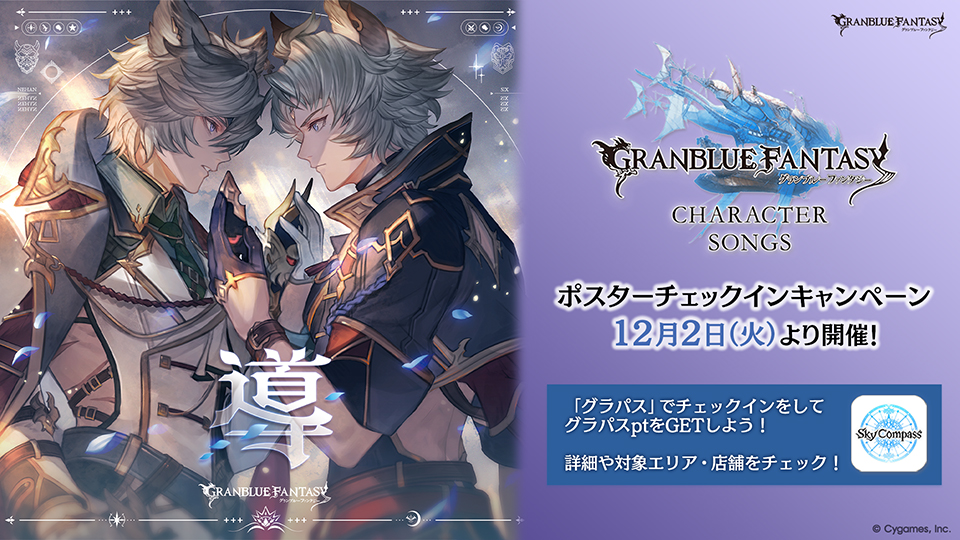 12月3日(水)に発売するキャラクターソング第37弾「導」の発売を記念して、対象の実店舗にてポータルアプリ『グランブルーファンタジー スカイコンパス』(以降グラパス)のポスターチェックインキャンペーンを開催いたします!