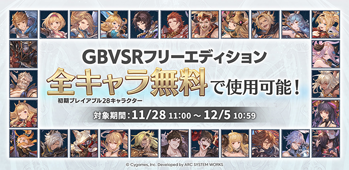 現在、無料で遊べる『GBVSRフリーエディション』では、期間限定で初期プレイアブルキャラクターの全28人を使用可能です。