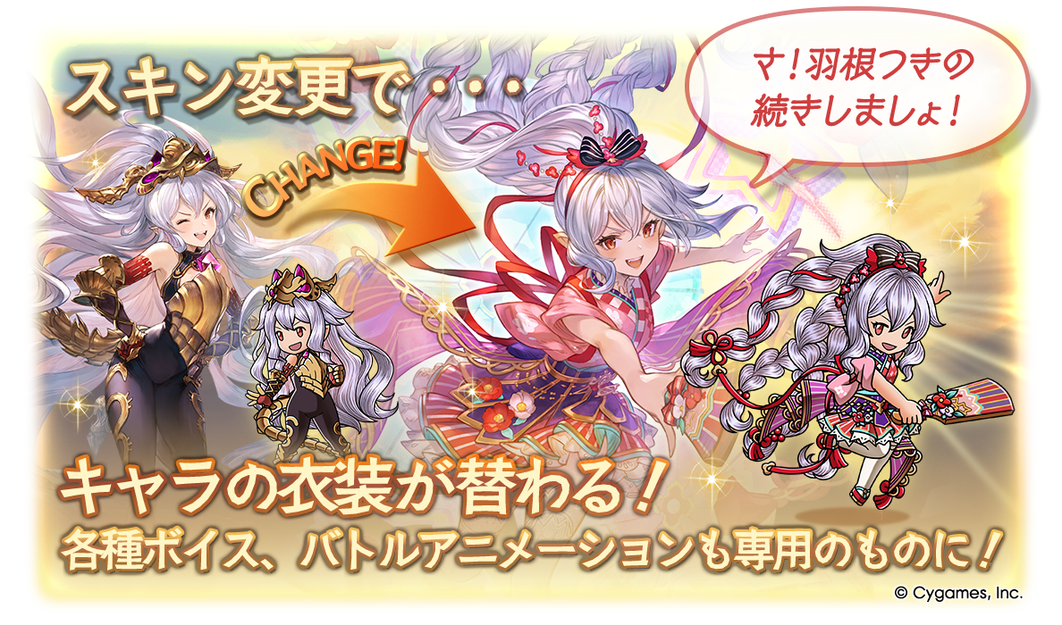 本スキンセットでは「レジェンド10連ガチャチケット」1枚と「キャラ専用スキン」1種類のセットを、3,000モバコイン、3,000グラブルコイン、3,000GREEコイン、または3,000DMMポイントで購入することができます。おひとり様、1種類につき1回のみの販売です。