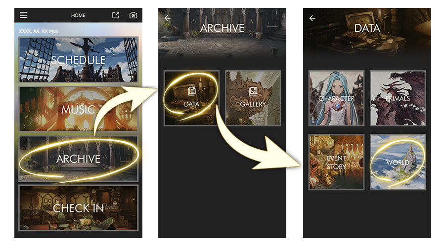 HOME画面から「ARCHIVE」へアクセスします。「ARCHIVE」の「DATA」へアクセスすると、「DATA」から「WORLD」へアクセスすることができます。