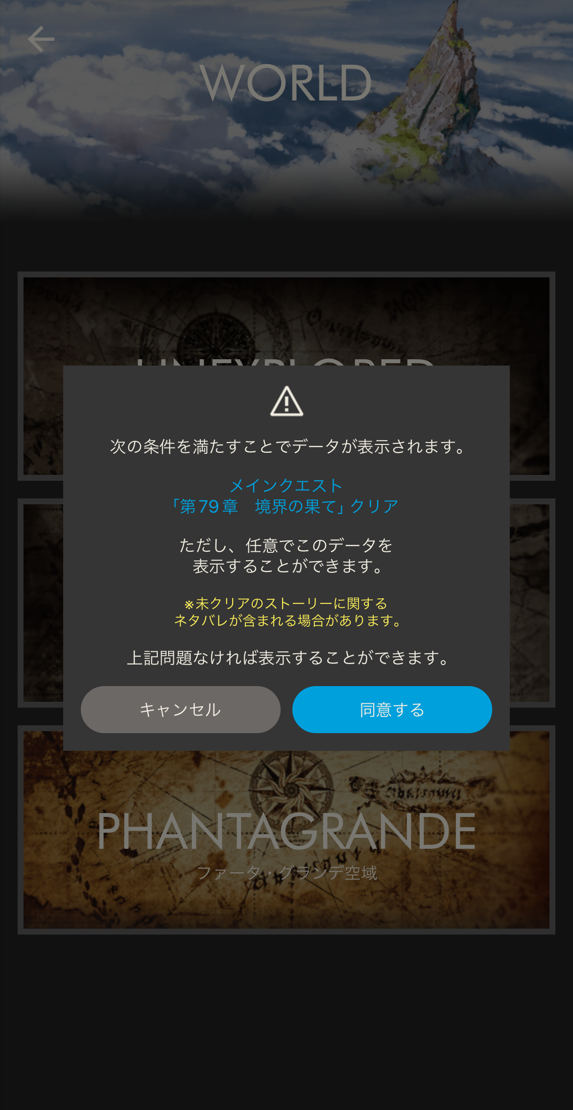 該当のメインクエストやイベントをクリアしていない場合、ネタバレを含む内容であることに同意することで、内容を閲覧することができます。