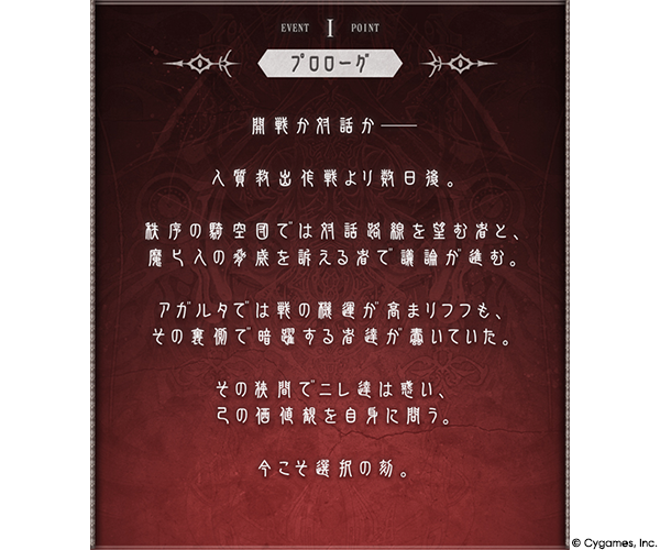 開戦か対話か──伝説の島アガルタにおける人質救出作戦より数日が経った頃。秩序の騎空団ではアガルタに対する措置について議論がまとまらず、アガルタ猟団では着々と開戦の準備が進んでおり、両者の間には緊張が走っていた。その狭間で揺れるニレ・キョウ・カーサ、何もできず自責するシア、誰にも心を開かずひとりで秘密を抱えるハイネ。そして、その刻が来た。